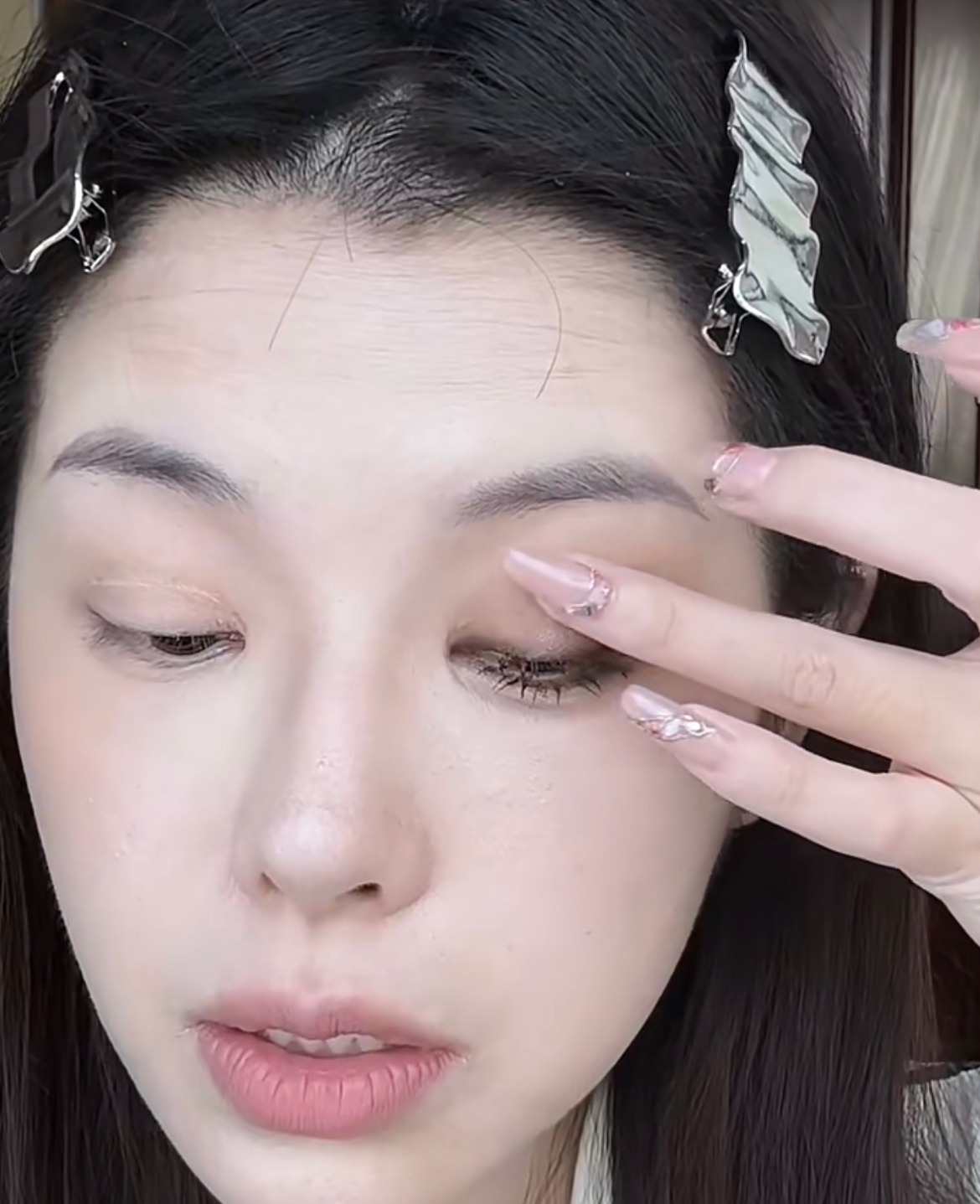 然後「胡還行」提到這個妝容的重點是要突出臉部的折疊度,令臉部看起來更加立體,因此需要提亮臉中、鼻基底、唇周、眉弓骨、額頭的位置,在使用粉撲拍打時原地拍開即可,不要弄花底妝。