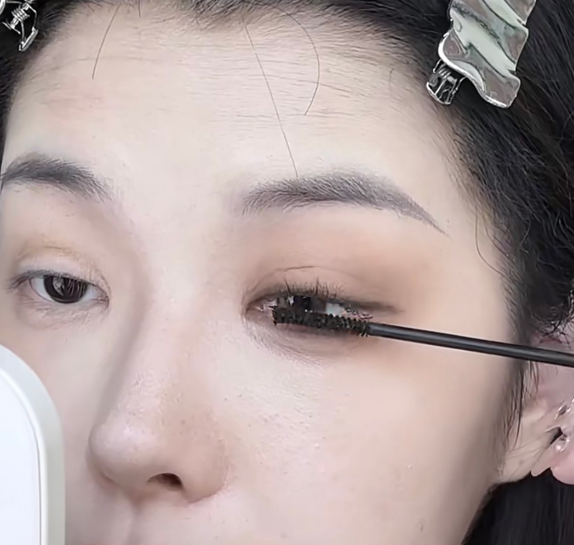 夾好睫毛後,再以Z字型從睫毛根部往上掃睫毛膏,再適量痴上幾根假眼睫毛,而下睫毛也一樣,這個時候已看得出有很大的分別了。