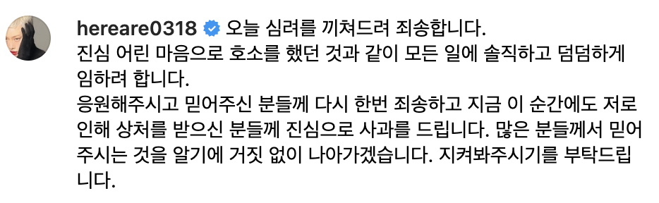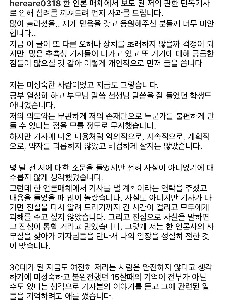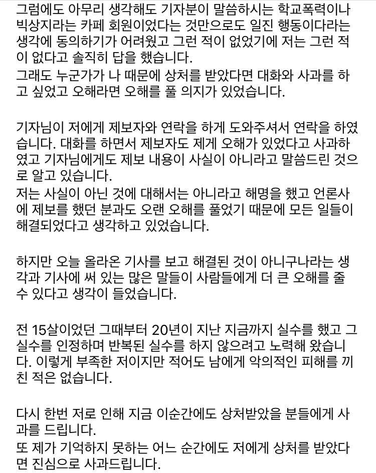 雖然金赫拉和韓媒各執一詞,但她在晚間卻突然將道歉文大幅刪減,重新發佈並剩下幾行字:「今天讓大家費心了真的對不起,如我真誠發出地呼籲一樣,會坦誠地面對一切。再次向支持、信任我的人道歉。知道有很多人會相信我,所以我會誠實地繼續前進,敬請期待!」不少網民表示一頭霧水,不明為何刪減原文內容。