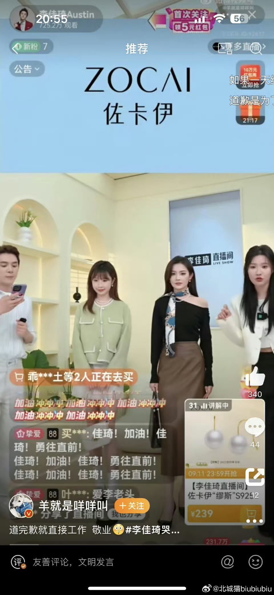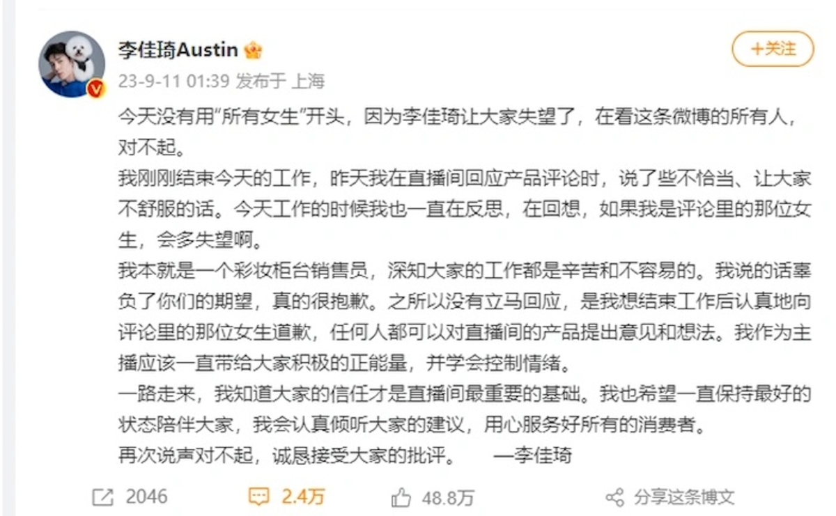 不過李佳琦的道歉並沒有平息網民的怒火,微博一夜之間有111萬粉絲取關,批評聲浪不斷。昨日,他又在直播間哭著道歉並引來440萬人上線觀看:「鄭重地和大家說句對不起,我會靜下心來深刻反思,再次感謝大家對我的批評和監督。」而他道歉後則是繼續推銷商品買貨,有網民諷刺:「是真的意識到問題?還是因為掉粉和雙十一要到了而道歉呀?」。