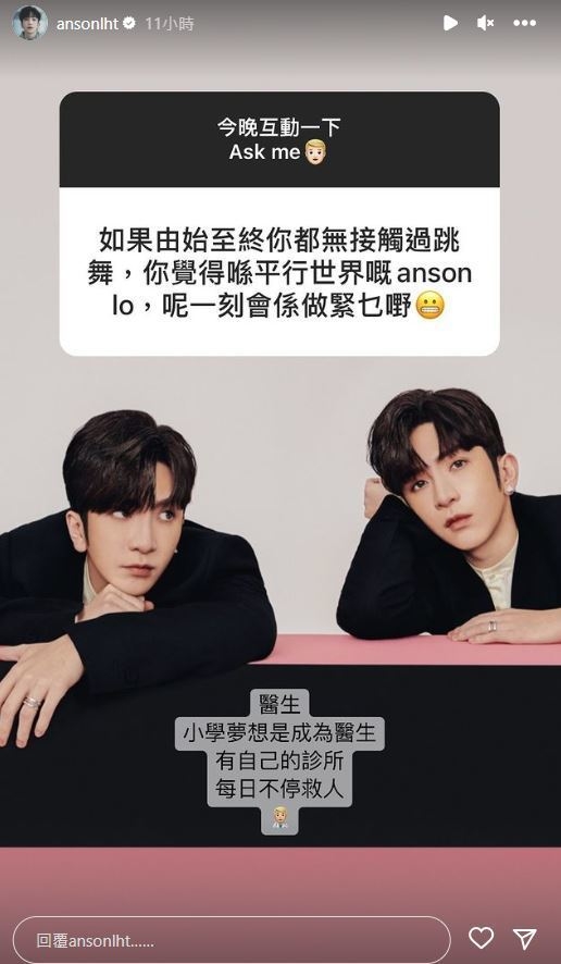 相信許多神徒都知道Anson Lo非常熱愛跳舞,在未入行前已經是一名舞蹈員,因此就有神徒問到他假如從來都沒有接觸過跳舞,在這一刻可能會做的職業。Anson Lo稱自己的小學夢想是成為一名醫生,並且有自己的診所,每日不停地救人,可見Anson Lo真的是非常有愛心。