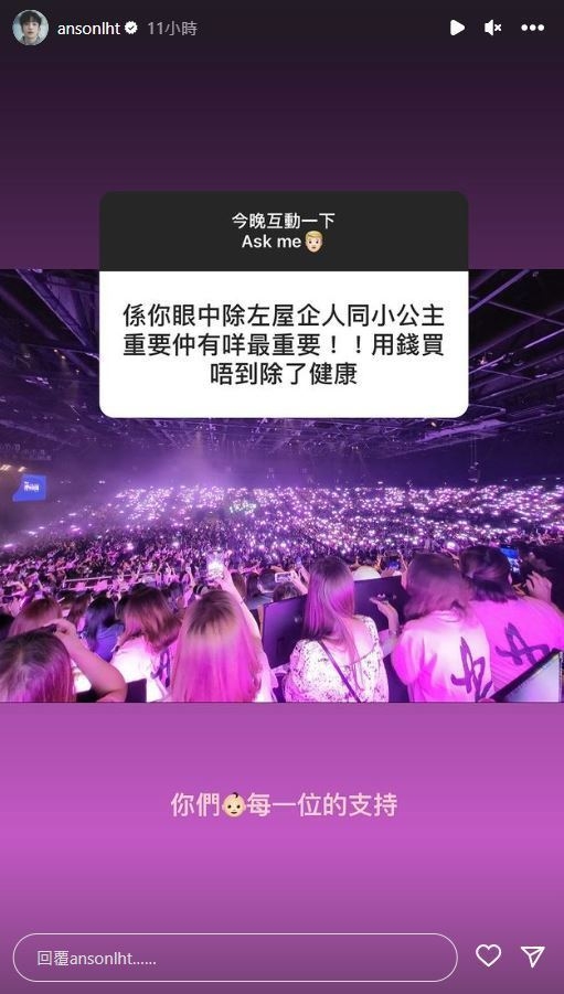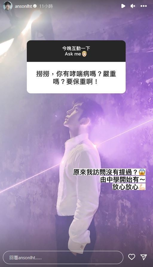 Mirror成員盧瀚霆(Anson Lo/教主)在上星期五生日,一眾神徒特意在中環海濱為他舉行大型的生日慶祝活動,期間Anson Lo亦有專程抽時間過來,場面非常熱鬧。日前Anson Lo在IG限時動態大玩「你問我答」,更自爆由中學開始就有哮喘,需要隨時攜帶哮喘藥,令神徒非常擔心!