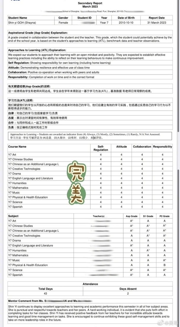 吳尊近年來工作重心轉移至內地,不僅帶家人到上海定居,一對子女也轉到內地讀書;吳尊曾在社交平台指出Neinei非常勤力:「有時候努力到我都叫她放鬆點!」他更忍不住曬出Neinei的優異成績:「自豪的我低調給你們看她的成績…完美了」Neinei的成績表上幾乎科科都是A,網民都忍不住讚:「不僅高顏值,成績也超優秀」。