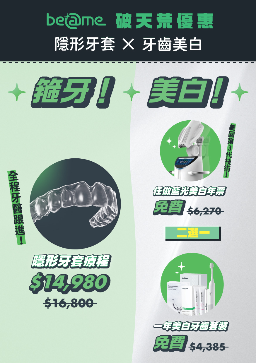 想一次KO牙齒不整及牙黃問題,就絕不要錯過現在be@me的限時優惠了!箍牙即送全年任做藍光美白牙齒(價值:HK$6,270/年),無創不傷牙,3小時即有肉眼可見的變白效果呢~而想安在家中美白牙齒的Sis或可選擇1年美白牙齒套裝(價值:HK$4,385/年),包括:聲波震動牙刷、美白牙膏、美白牙貼、去黃液等。優惠超實用、CP值極高!要一次實現完美笑容So Easy呀~
