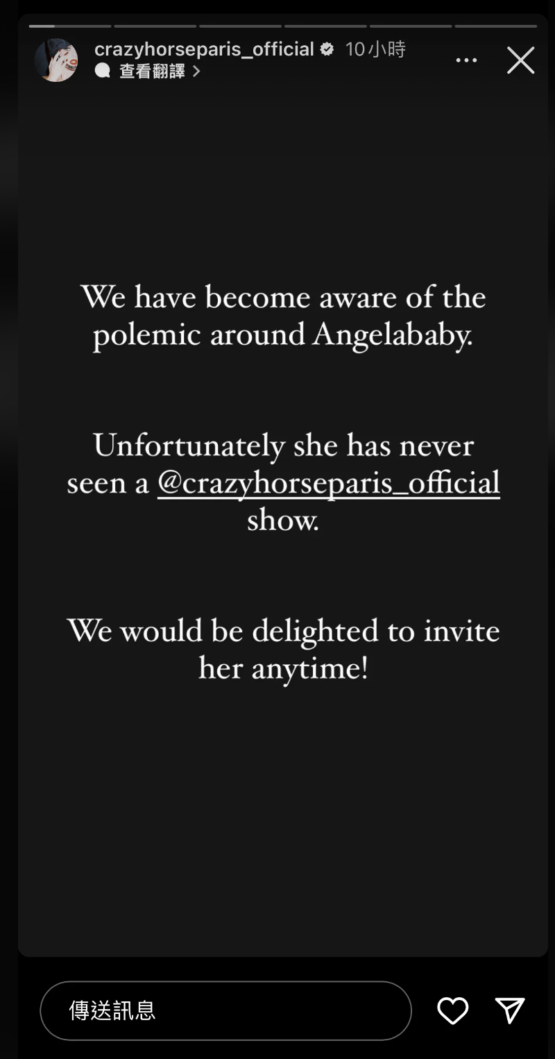 而在事情發酵數日後,瘋馬秀官方IG竟然出面為baby 澄清,指baby 從未前往觀看!! 事情峰迴路轉,不知道內地的網民又是否收貨!