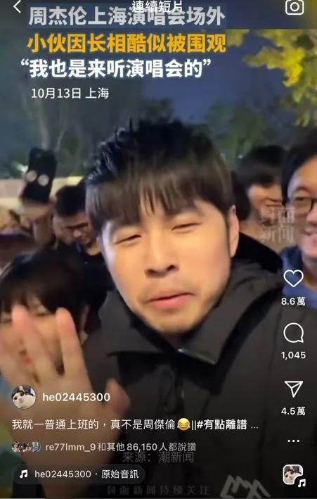 除此之外,當周杰倫在上海開演唱會時,一位粉絲因為五官同走路姿態神似周傑倫而引起轟動,該名路人不單髮型相同,就連臉上的鬍渣也非常相似,讓一旁的粉絲一度要求合影,不過他也害羞表示自己不是一名網紅,只是一名普通人,下了班才過來聽演唱會。眼見民眾情緒過於激動,他只好戴上帽子迅速離開。