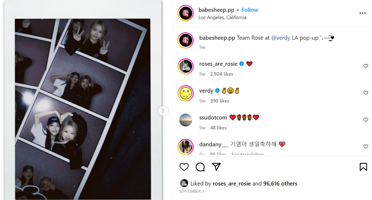 這名經紀人名為Jane Kim,是負責BLACKPINK海外行程的助理兼經紀人,不時也會在IG上更新BLACKPINK的動態以及自己的日常照片。因為經常分享Rosé的動態,加上超高顏值,所以IG粉絲人數暴增至13.6萬,而且和Rosé的關係和相處也如親姐妹般,除了在日常工作中經常被拍到細心照顧Rosé、為粉絲開設IG Highlight 專欄,而且私下兩人也擁有許多合照,Rosé還會在留言區下留言,可見兩人的好感情。