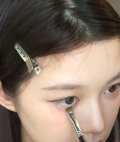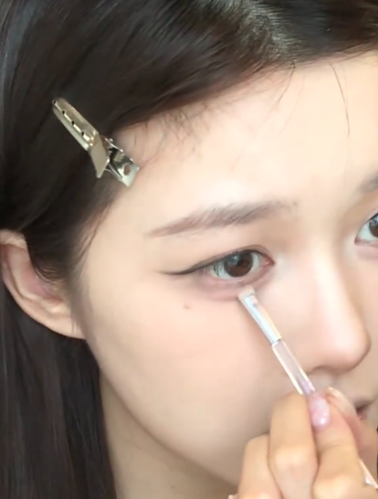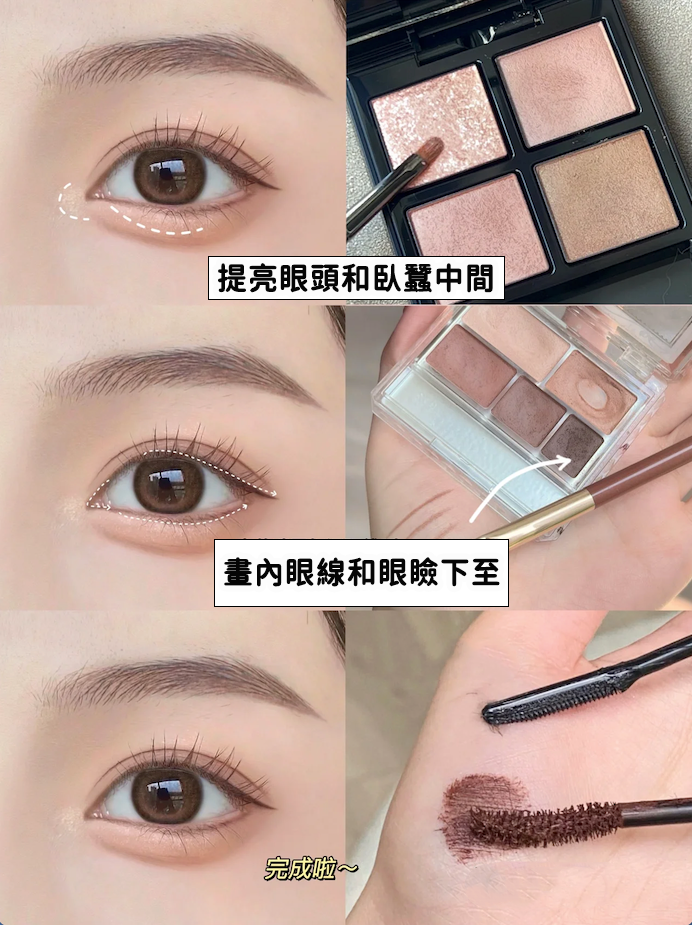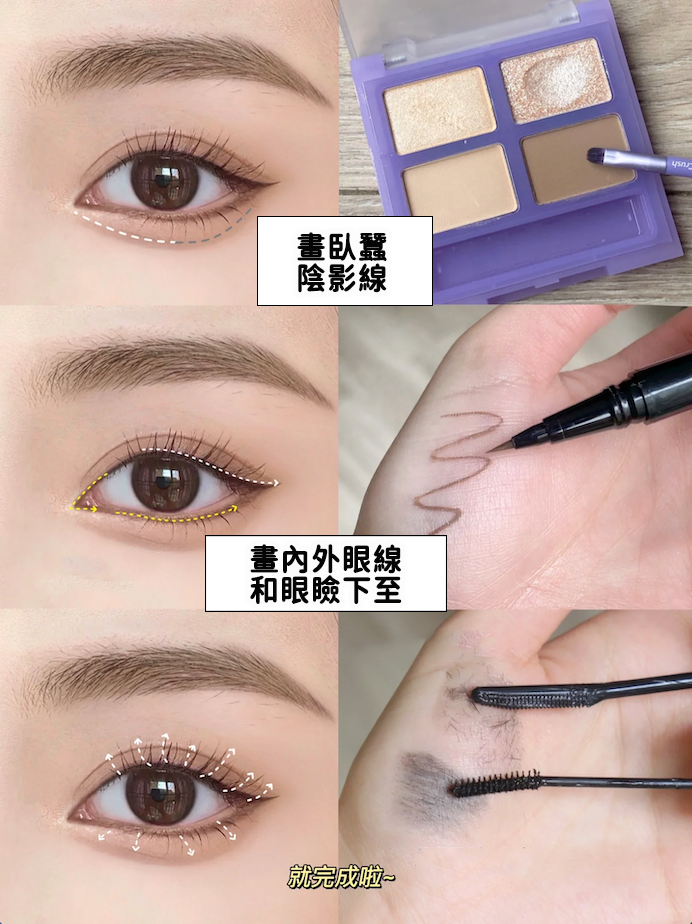 再換上扁頭的臥蠶掃畫出臥蠶陰影線。其後使用深啡色眼線筆畫上內外眼線和眼瞼下至,畫好後再用棉花棒暈梁自然。最後再塗上睫毛膏就完成了!