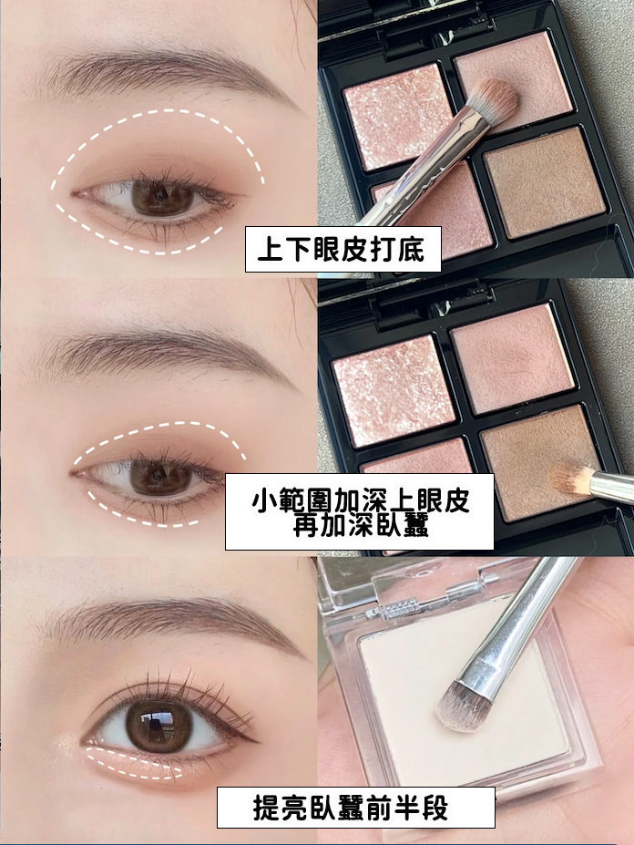 先在上、下眼皮大範圍掃上大地色的眼影,再塗抹淺啡色眼影在雙眼皮褶皺和臥蠶位置,幫助進一步加深。然後使用啞光白色提亮臥蠶前半段,記得要從眼頭向後提亮,不要來回掃。