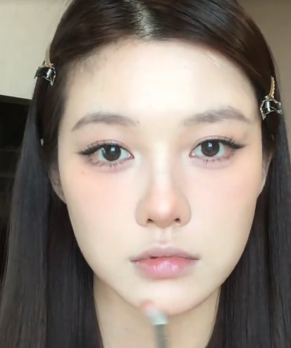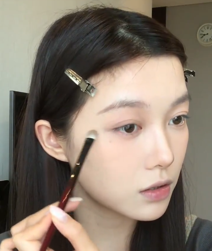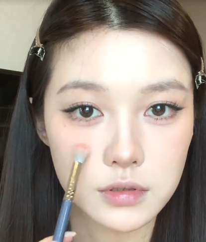 然後是提亮部分,分別在兩眉中間和鼻樑畫上打亮,再慢慢推開,接著在眼下、面中、鼻翼再畫上第二層提亮,增加臉部立體深淺度,打造出張員瑛的小臉效果。