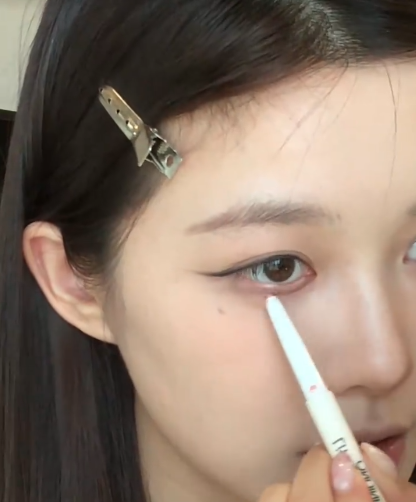 再使用臥蠶筆畫到眼尾2/3的地方,尾部稍微有點往下垂的感覺,有助進一步放大眼睛,而臥蠶的陰影也要畫得稍微寬一點!