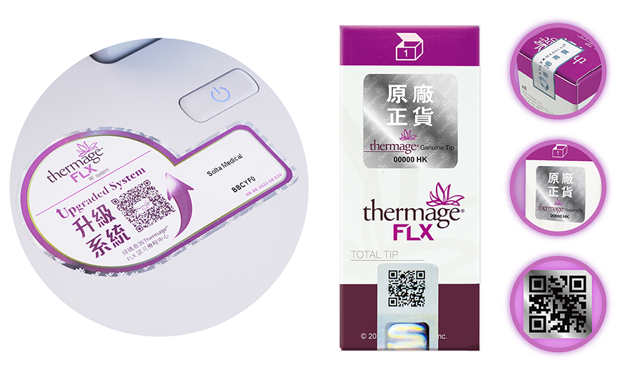 - 探頭包裝盒上貼有「原廠正貨」雷射標籤及有「Solta Medical香港專賣」封條,盒底亦貼有二維碼QR code認證封條,確保一次性使用,衛生又安全。