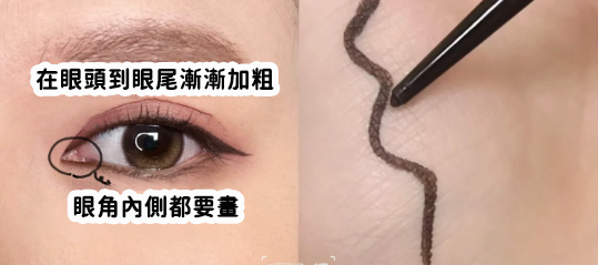 其後使用深啡色眼線在眼頭開始畫到眼尾,漸漸加粗,下眼線亦需要畫上眼線,記得眼角內側都要畫!