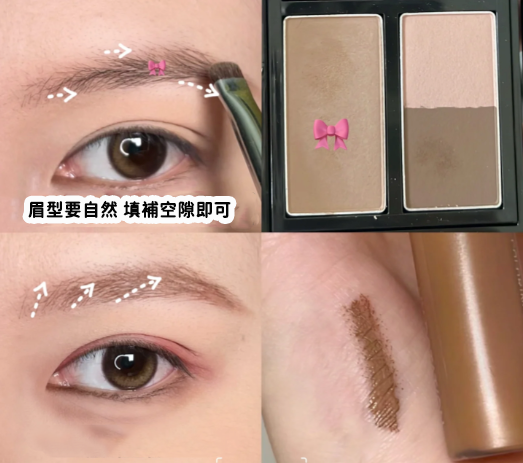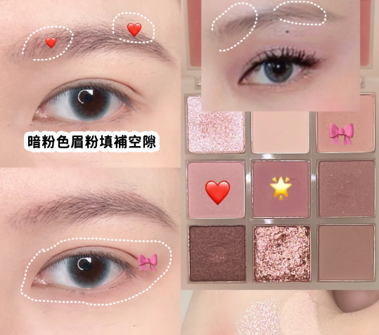 先使用帶點暗粉色的眉粉填補空隙,然後用淺粉色眼影掃在上下眼皮。