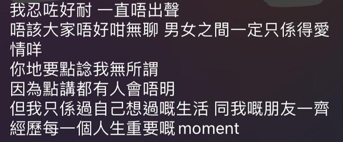 他又續說「我忍咗好耐 一直唔出聲 唔該大家唔好咁無聊 男女之間一定只係得愛情咩 你哋要點諗我無所謂 因為點通都有人會唔明 但我只係過自己想要嘅生活 同我嘅朋友一齊經歷每一個人生重要嘅moment」、「由頭到尾都係你哋自己幻想出 然後仲要攻擊我朋友 我已經唔出聲 Yes我哋係以family相稱 代表我哋感情好好有咩問題」