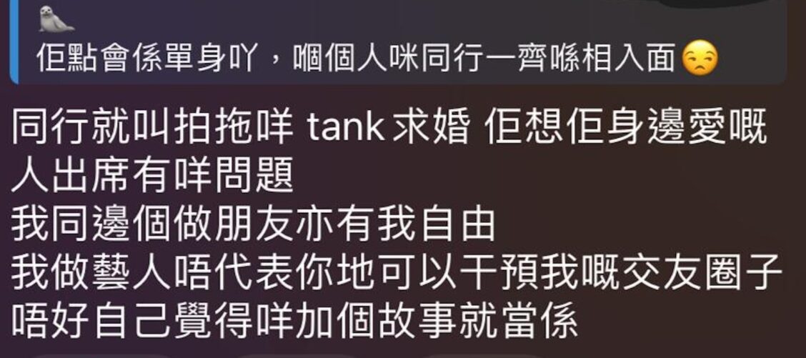粉絲的討論卻引來AK回覆反擊,他表示「同行就叫拍拖咩 tank求婚 佢想佢身邊愛嘅時人出席有咩問題 我同邊個做朋友亦有我自由 我做藝人唔代表你哋可以干預我嘅交友圈子 唔好自己覺得咩加個故事就當係」