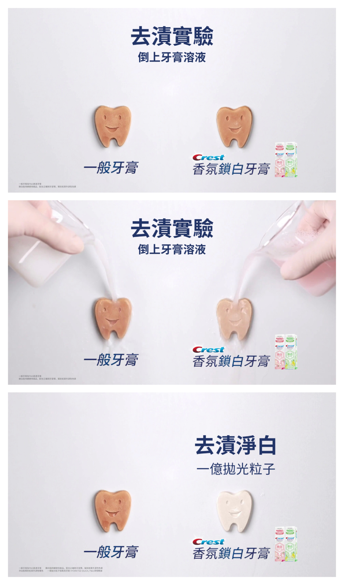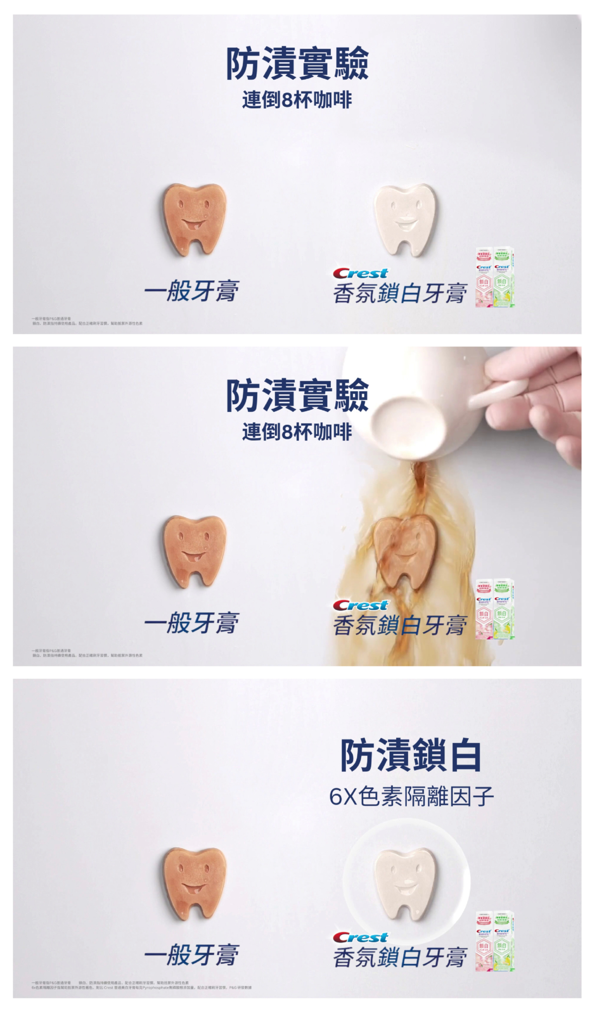 想知道Crest的雙重美白效果有多驚艷,看以下的去漬防漬實測就明白了!在去漬功效方面,以牙膏液沖洗牙片,使用一般牙膏的牙片顏色並沒有改變,而使用香氛鎖白牙膏的牙片整塊變亮白了!可以放心交給Crest擊退頑固牙漬,幫牙齒去漬淨白!
