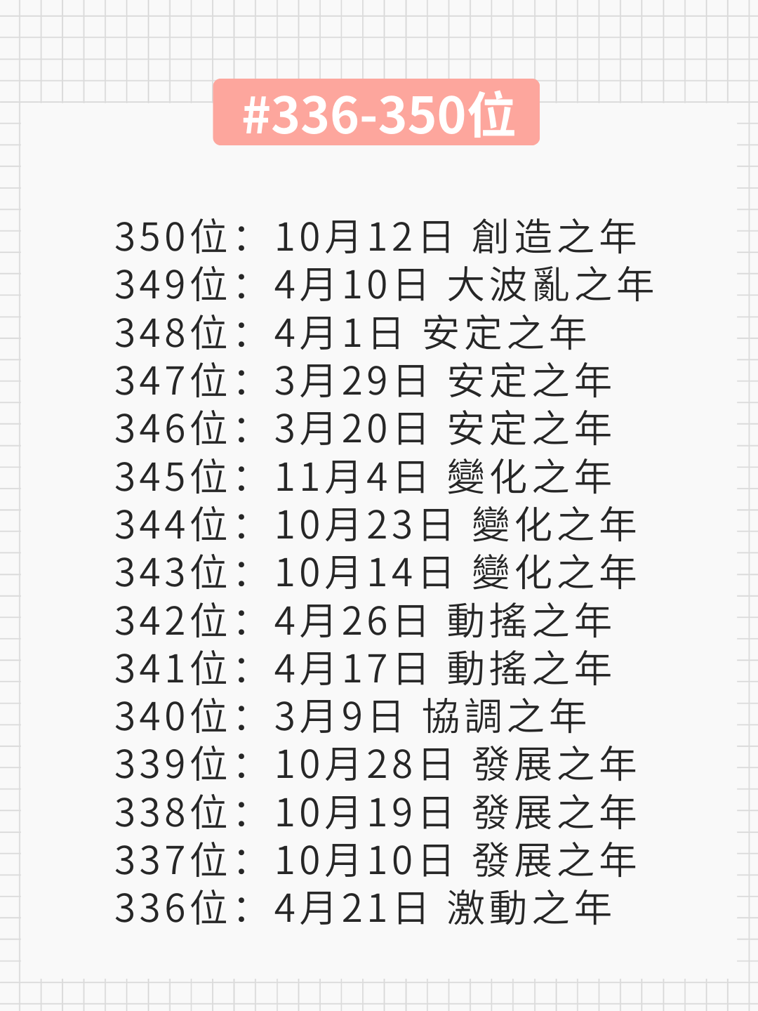 排名336至350名的你們,很多朋友會迎來「變化之年」和「創造之年」,來年可能是出現重大改變的一年,所以做重大決定的時候一定要謹慎!而且你們有機會要接受新挑戰及新嘗試,要加油啊!