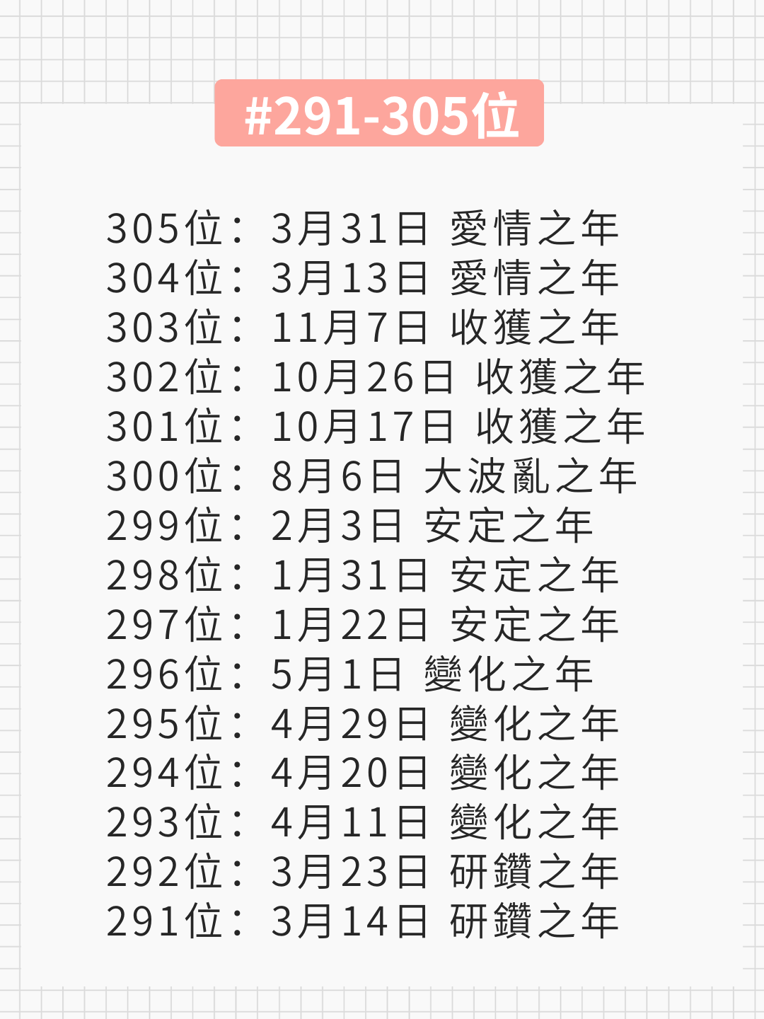 排名291至305名的朋友,有些人迎來「安定之年」及「收獲之年」,只要腳踏實地做適合你的事情,就可以完成目標,有些人的願望也可能會在下年成真!
