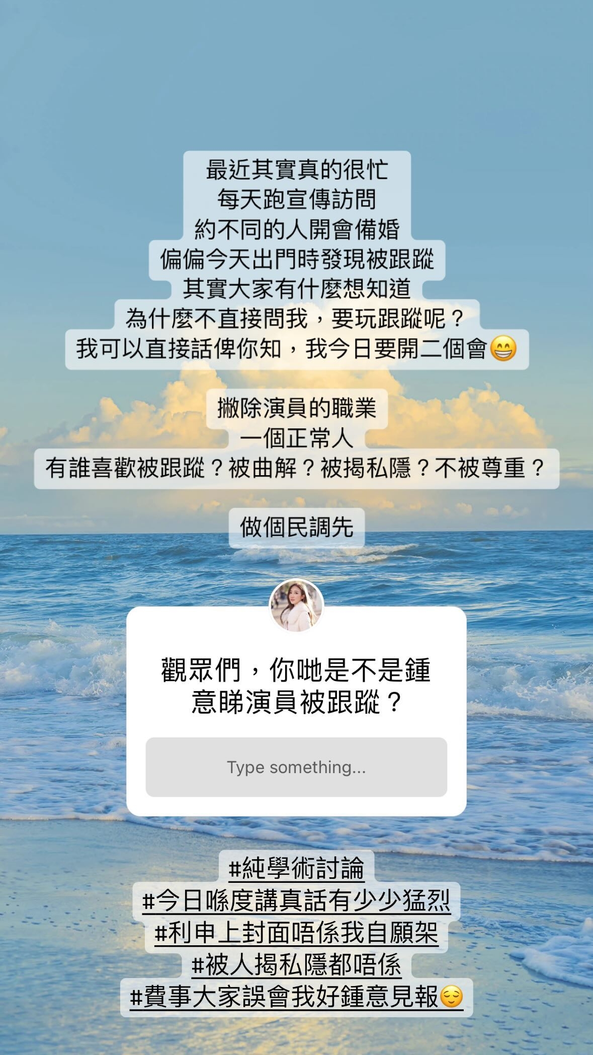 日前何依婷突然在IG發布Story,她寫上:「最近其實真的很忙,每天跑宣傳訪問,約不同的人開會備婚。偏偏今天出門時發現被跟蹤,其實大家有什麼想知道?為什麼不直接問我,要玩跟蹤呢?我可以直接話俾你知,我今日要開二個會。撇除演員的職業,一個正常人有誰喜歡被跟蹤?被曲解?被揭私隱?不被尊重?」。