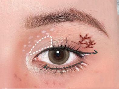 之後再次沾取淺粉色眼影掃在眼頭,再使用啡色眼線筆拉出一條眼線,並填補睫毛空隙、畫上眼瞼下至,再在啡色眼線下方拉出一條白色眼線,並畫出下眼睫毛。最後再在雙眼皮褶皺上方,使用眼線筆畫出兩個鹿角,注意一定要在褶皺上面,否則很快便會脫妝!