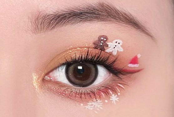 接著貼上五簇自然濃密款的假睫毛,再使用白色和啡色眼線筆畫上兩個薑餅人,再使用紅色和白色眼線筆畫上聖誕帽、雪霜圖案,最後再使用啡色和紅色眼線筆畫上眼尾,即完成啦!