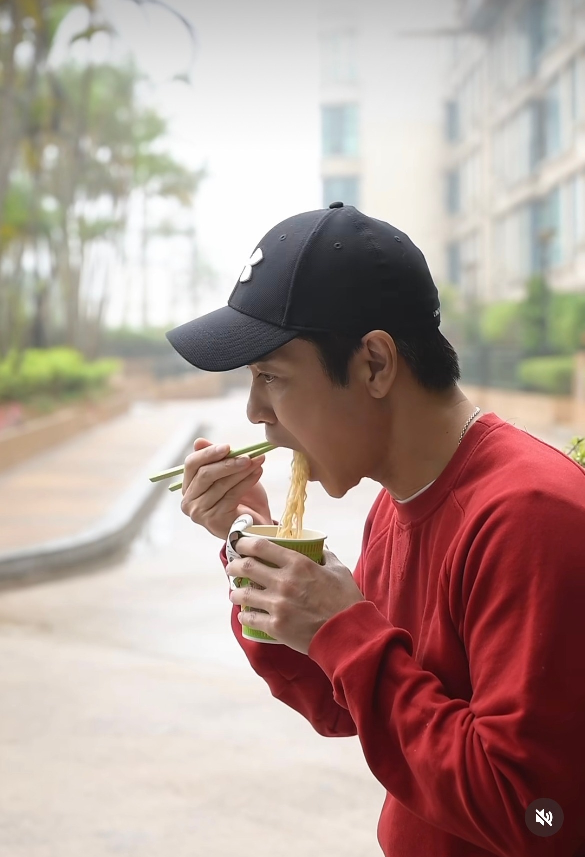 鄭嘉穎獨自在路邊食杯麵