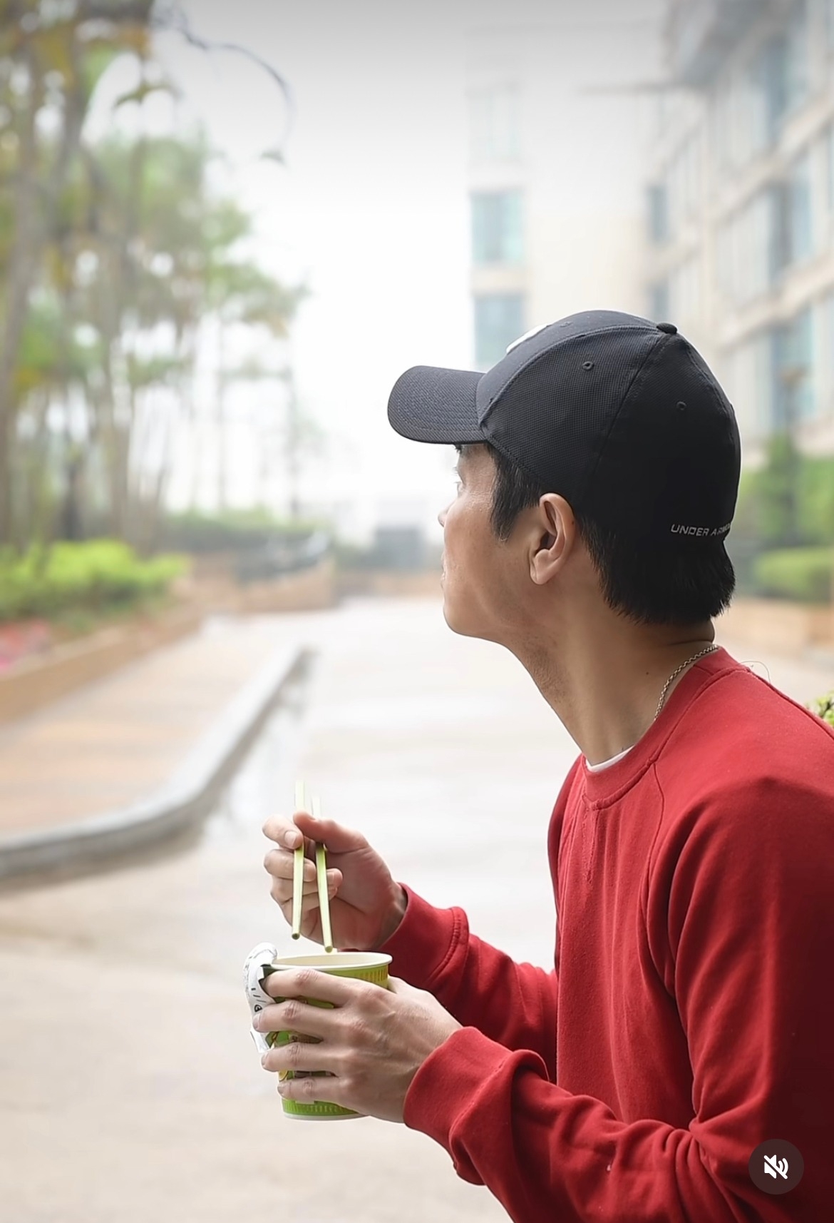 但沒想到之後突然畫風一變,只見鄭嘉穎一個人在屋企樓下的一條路邊吃著杯麵,而他的臉上更流露出非常落寞的神情,非常好笑!