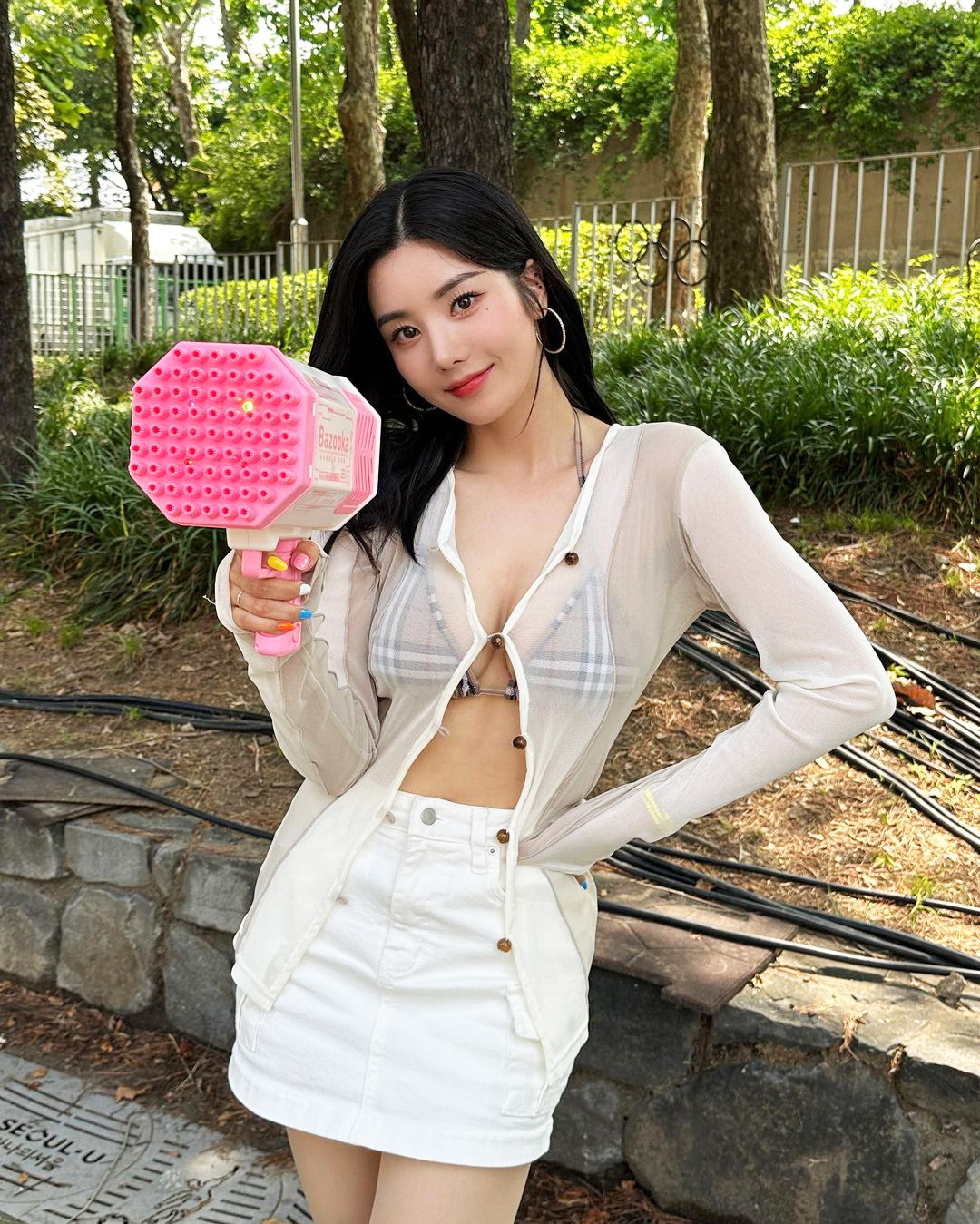 權恩妃在韓國潑水音樂節「Waterbomb」上,穿著性感火辣的Bikini,再搭配上一層透膚外套,若隱若現地呈現出她的好身材和美胸,還散發出一絲絲神秘的感覺,性感氛圍拉滿!而權恩妃日常穿搭也經常將透膚裝融入到穿搭內,例如:將黑色透膚外套搭配白色背心,給人一種又純又欲的感覺;或是同色系的透膚裝+內搭也會給人一種清純又帶點小性感哦~