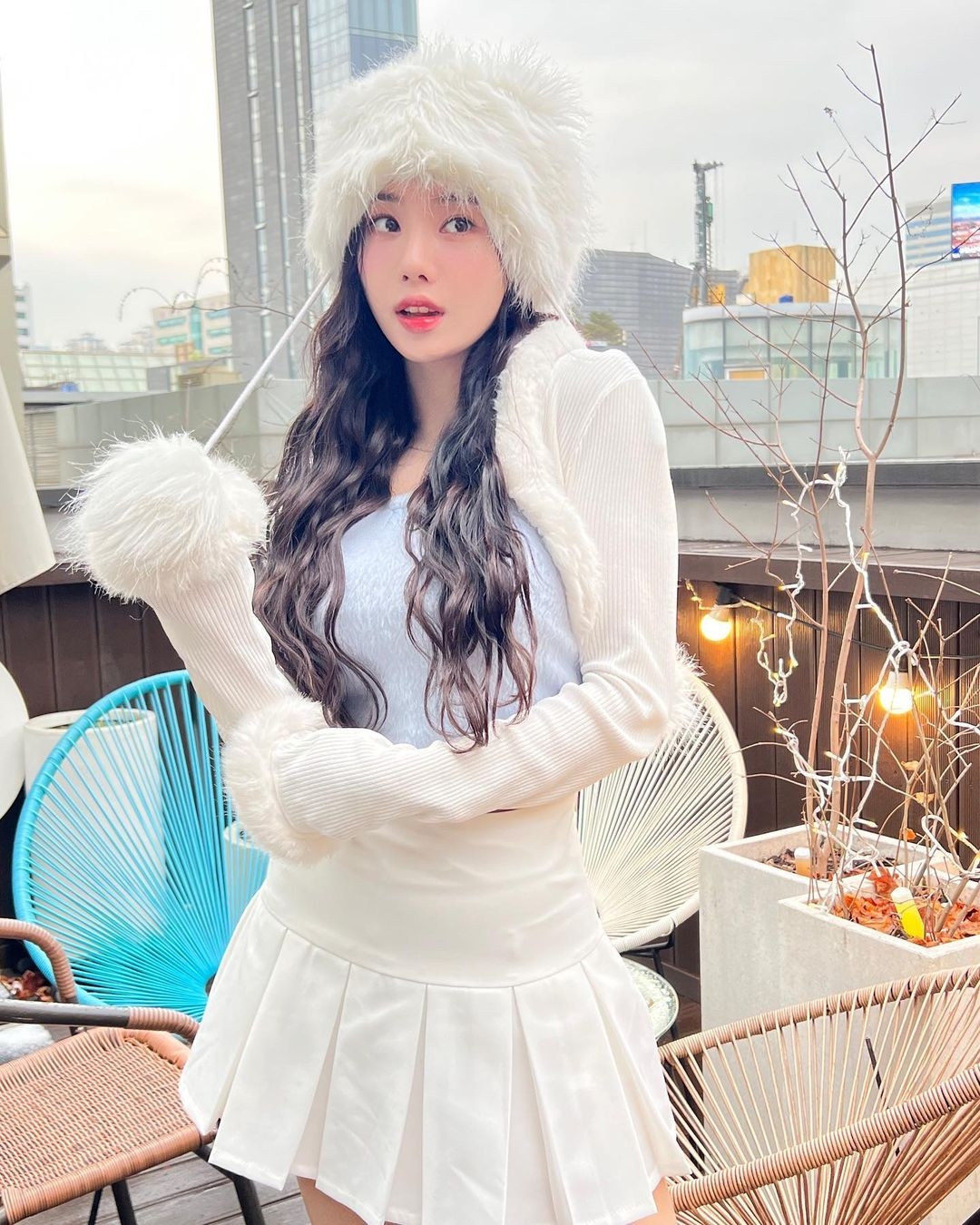 想要用羽絨外套搭配出純欲感?不妨試試權恩妃這一套「下半身失蹤穿搭」,以衛衣搭配羽絨外套,下半身則選擇短裙或百褶裙,滿滿的學院風~腳上還可以穿上白色長襪或是及膝的泡泡襪,這樣看上去更似青春洋溢的大學生,俏麗又性感~