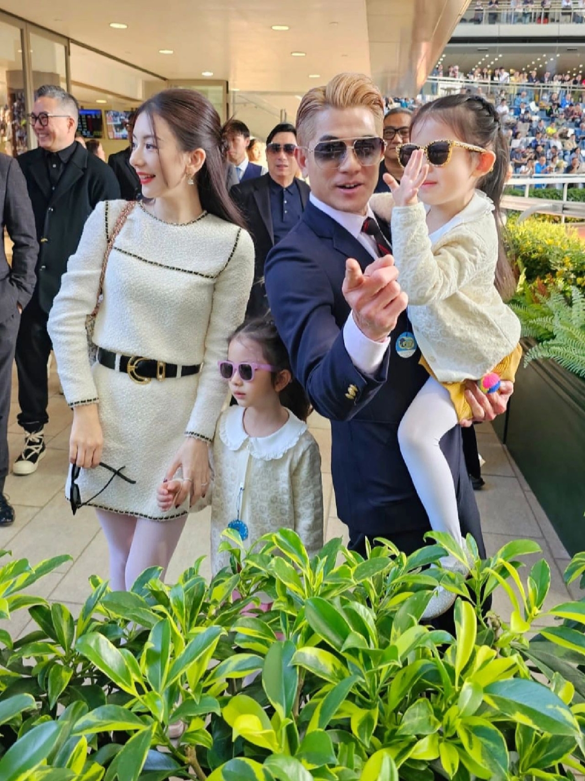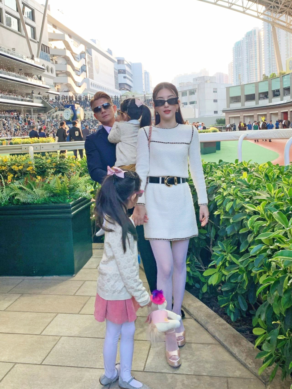 日前天王郭富城前往馬場為愛駒「舞林密碼」加油打氣,老婆方媛和兩個寶貝女兒也一同出席,一家四口一出場就即刻引發現場騷動,而其中方媛和女兒們的穿搭更是成為了焦點。當天兩個女兒Chantelle和Charlotte身穿小洋裝搭配外套,加上白色褲襪和皮鞋,頗有名媛風範,而方媛則全身白色CHANEL小洋裝。