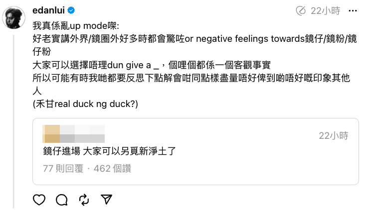 Edan在抒發完感受後提到「坦白講我都唔知自己可唔可以咁real,實在太多嘢要顧慮,但我又真係好想講」,不過很多網友都留言力撐Edan「鍾意你夠 real」、「其實偶像嘅框框係邊個定」、「欣賞你」!而且Edan曾在個人演唱會結束後飽受負評,之後他在IG為藝人發聲,強調「藝人都係人,藝人都會有感受,但個世界好似禁止咗藝人有感受/表達感受。」