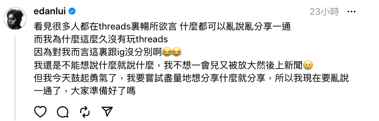 Edan時隔20星期再次在社交平台Threads發文,他先是上傳一張自拍照向大家打招呼「Long time no see hii」,之後他表示自己看到很多人都在threads暢所欲言,什麼都可以亂說亂分享一通,而自己這麼久沒有玩threads的原因,是因為對他來說這裏跟ig沒分別,不能想說什麼就說什麼,但今天鼓起勇氣想分享什麼就分享。
