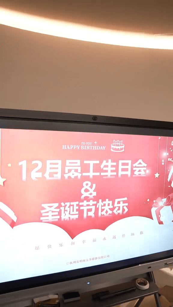 最後螢幕上寫住「12月員工生日會與聖誕節快樂」,原來還一同慶祝聖誕,相當用心!