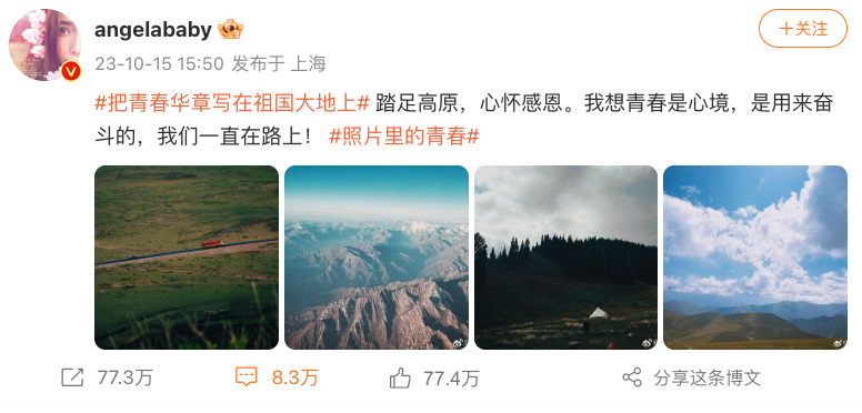 Angelababy在月中曾在微博分享多張風景照,並寫上愛國言論:「踏足高原,心懷感恩。我想青春是心境,是用來奮鬥的,我們一直在路上」,似乎是想挽救形象,有不少粉絲都留言表示支持她:「希望你天天開心,我們一直都在」、好久不見,希望你開心,想你」。但也有網民認為:「早該封殺了」。