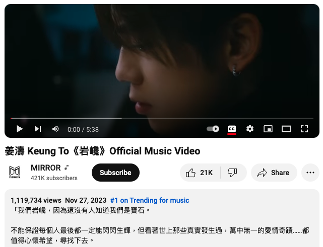 據悉,以往姜濤推出新歌MV,包括《鏡中鏡》、《作品的說話》、《Dummy》等,YouTube點擊率在不足24小時內都能超越100萬,但《岩巉》MV上架一星期都仍然未超越100萬,要去到第八日才打破,點擊率的上升幅度比以往慢了許多,估計是因為有部分姜糖疑「接受不到」MV中的甜蜜情節,因此發起罷睇行動。