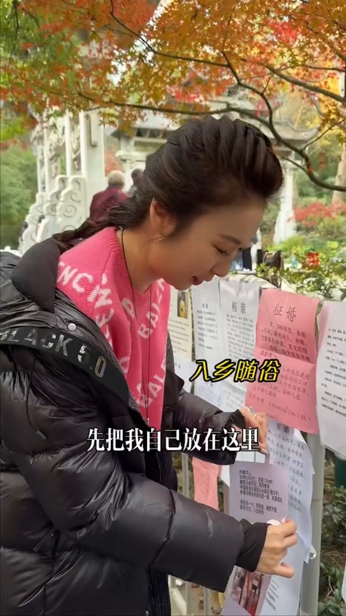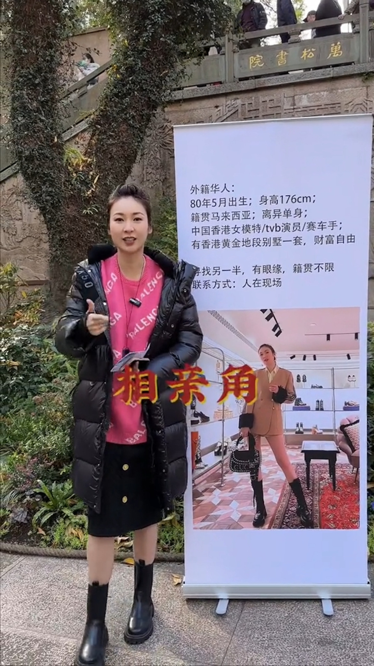 近年將工作重心轉移內地的莊思敏,日前在內地社交平台分享在杭州公園內的「相親角」相睇的影片,更說到:「今天就來內地相親角看看能不能遇見我的真愛!」片中莊思敏做足準備,不僅準備了簡歷單張,更是將自己的照片和個人資料製作成易拉架大公開,誠意十足!