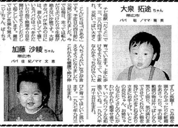 然而兩人的緣分也並未就此結束,有趣的是,大泉拓途和加藤沙綾的媽媽都同時保留了當年(1999年2月22日)的報紙剪報,而且大泉母親還表示,當時因為看到BB上報,所以要剪下來留念,卻也被兒子一旁的孩子吸引了目光,甚至覺得「沙綾」這個名字很可愛,並想著如果女兒出世,也要取一樣的名字。因此在女兒出世之後,也將其取名為「沙綾」!