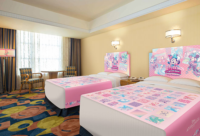自1/19開始,Disney Ambassador Hotel 更是推出以米妮為主題的客房,床和牆壁上都有米妮圖案,連桌子上也有米妮樣式,簡直就是被米妮包圍太夢幻了,而且入住之後還會送上專屬鎖匙、明信片及小本子,通通都可以帶回家!而且度假區也將開賣Minnie's Funderland設計的門票,整張粉紫色的卡片設計讓人好想擁有!