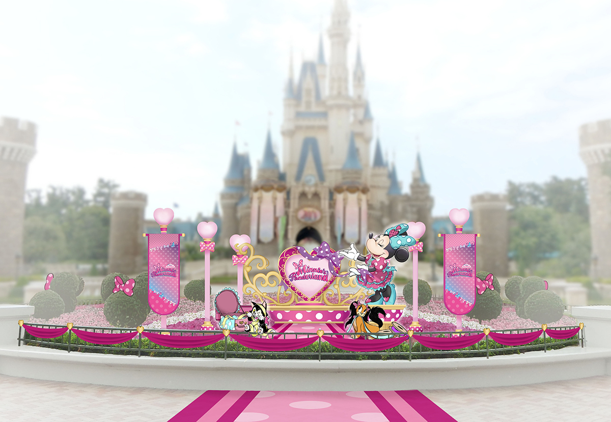 在「米妮樂園」可以處處看到米妮的身影,從入口處的圓形花壇開始就會直接看到用花草排列的米妮圖案,而且在世界市集也會出現超大的米妮經典「蝴蝶結擺飾」!除了園區內擺設,你也可以在很多的細節上發現米妮的蹤影,好似通往灰姑娘城堡的廣場地板也變成了「粉紅圓點圖案紅地氈」;園區裡洗手區更可以壓出米妮造型的肥皂泡泡,超萌的小設計,令人忍不住想一直洗手!