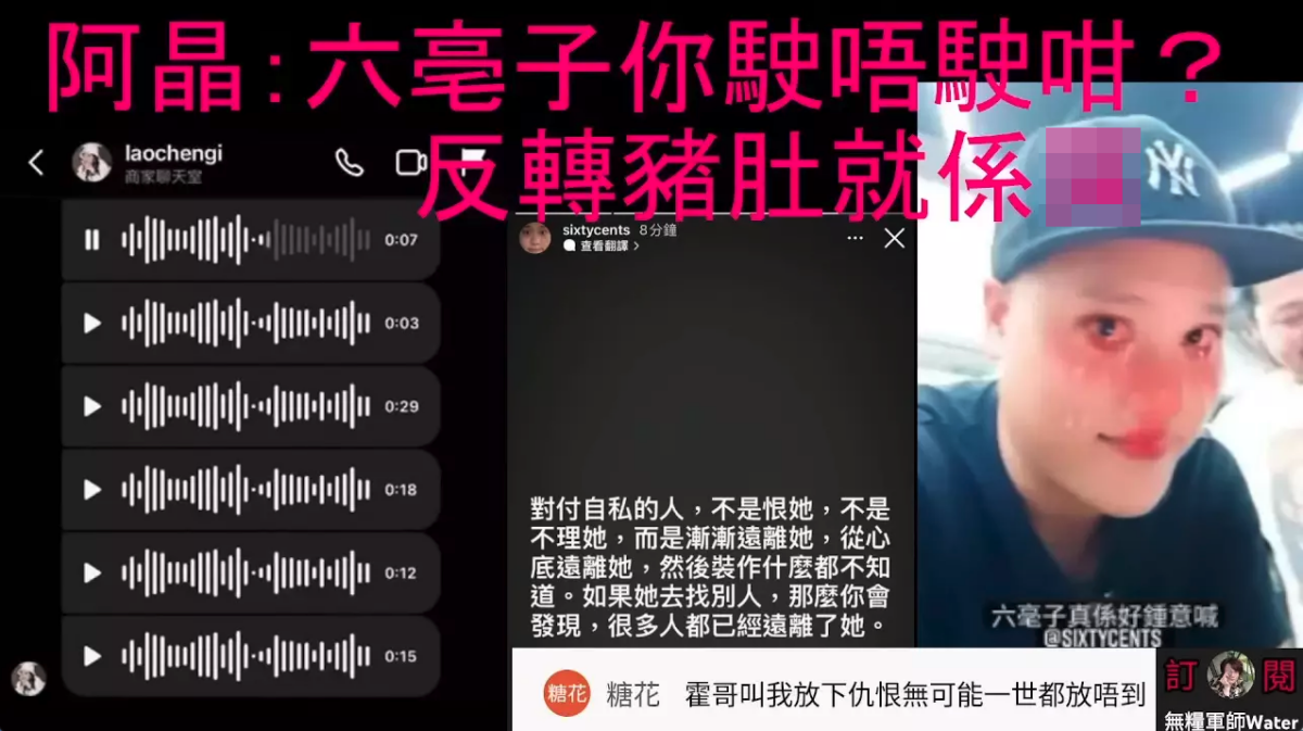 不過之後網上就流出疑似是阿晶的語音,YouTube頻道「無糧軍師Water」透過影片整合事件,當中提到2021年阿晶離職時,曾經希望以朋友身份請六毫子食飯,兼多謝對方以前曾提供不少工作給她,但六毫子卻沒有理會阿晶。於是不少網民都認為與六毫子口中所說的「阿晶辭職後仍與她保持溝通」完全不同。