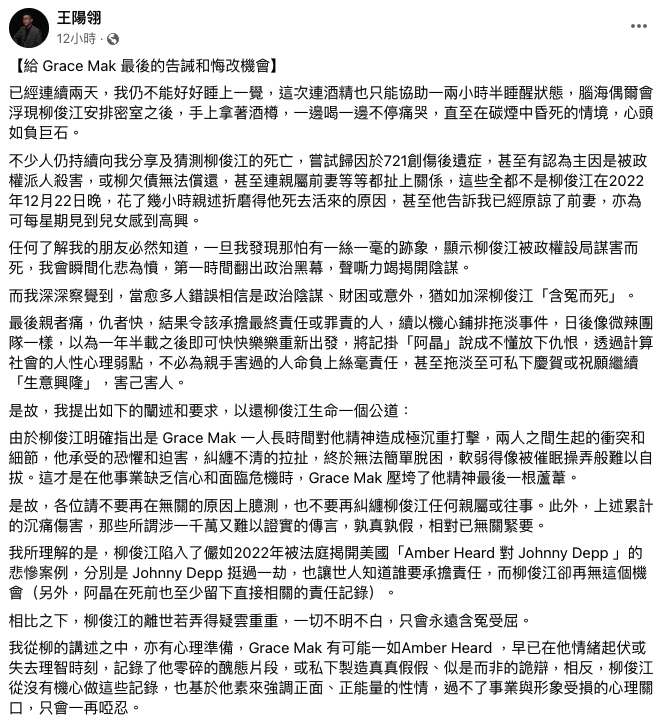 日前現居於台灣的專欄作家王陽翎突然在社文平台發文,他表示連日來外界對柳爺輕生原因有不同的揣測。他透露Grace Mak長時間對柳俊江精神造成極沉重打擊「兩人之間生起的衝突和細節,他承受的恐懼和迫害,糾纏不清的拉扯,終於無法簡單脫困,軟弱得像被催眠操弄般難以自拔。這才是在他事業缺乏信心和面臨危機時,Grace Mak 壓垮了他精神最後一根蘆葦。」