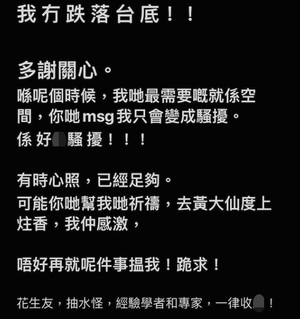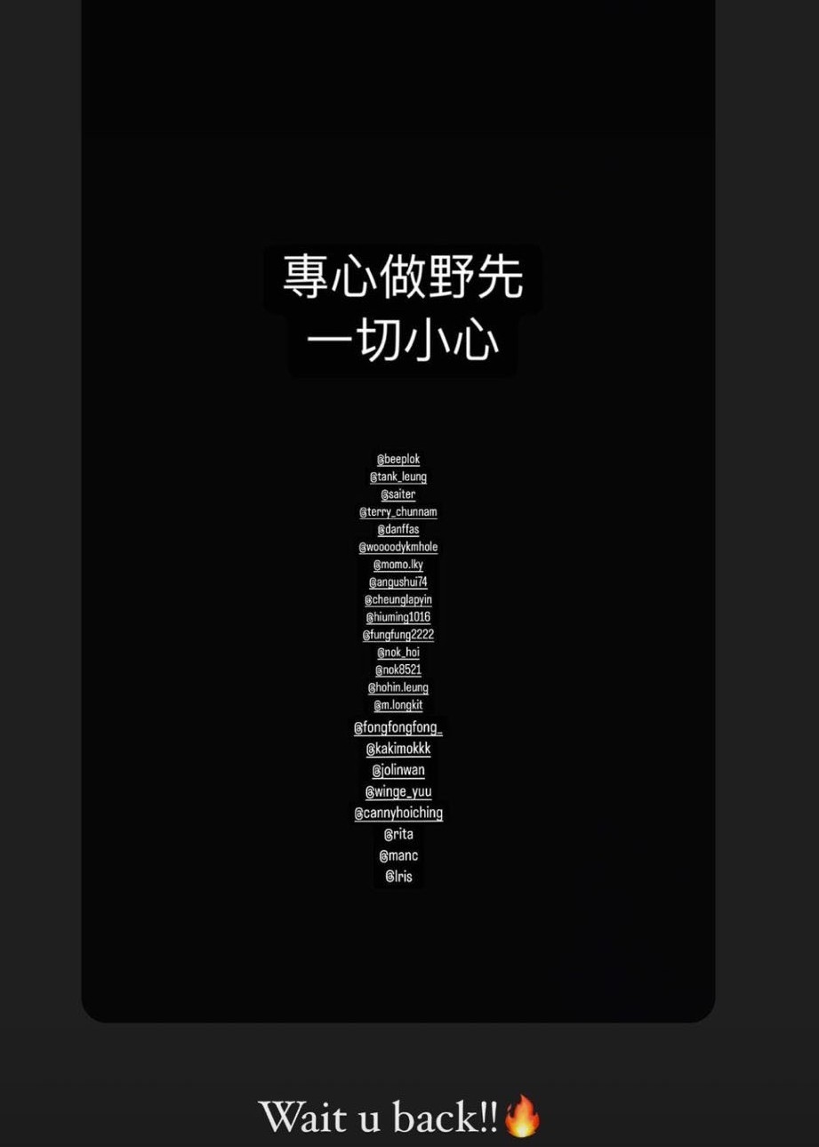 而Stanley亦曾在IG Story寫上︰「一定要順順利利,平平安安!」,姜濤也同樣在IG Story寫上:「不求別的,只求所有人都要平平安安」,但很快便刪除了該帖文。