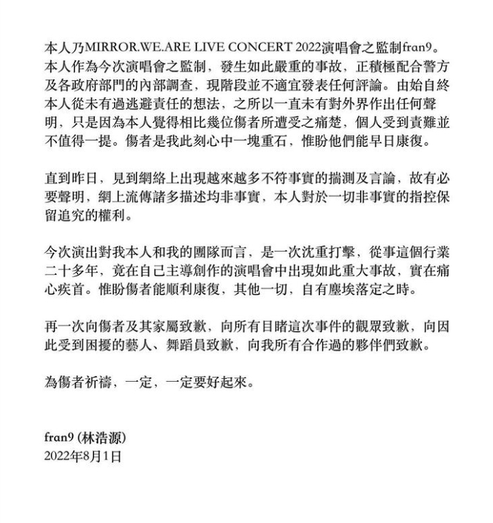 今日MIRROR演唱會監製Fran9首次發出聲明道歉,表示自己正積極配合警方及各政府部門的內部調查,因此自己不方便發表任何評論。他強調自己從來沒有想逃避責任,內心盼望傷者早日康復,並且對於網上流傳的非事實指控保留追究權利。
