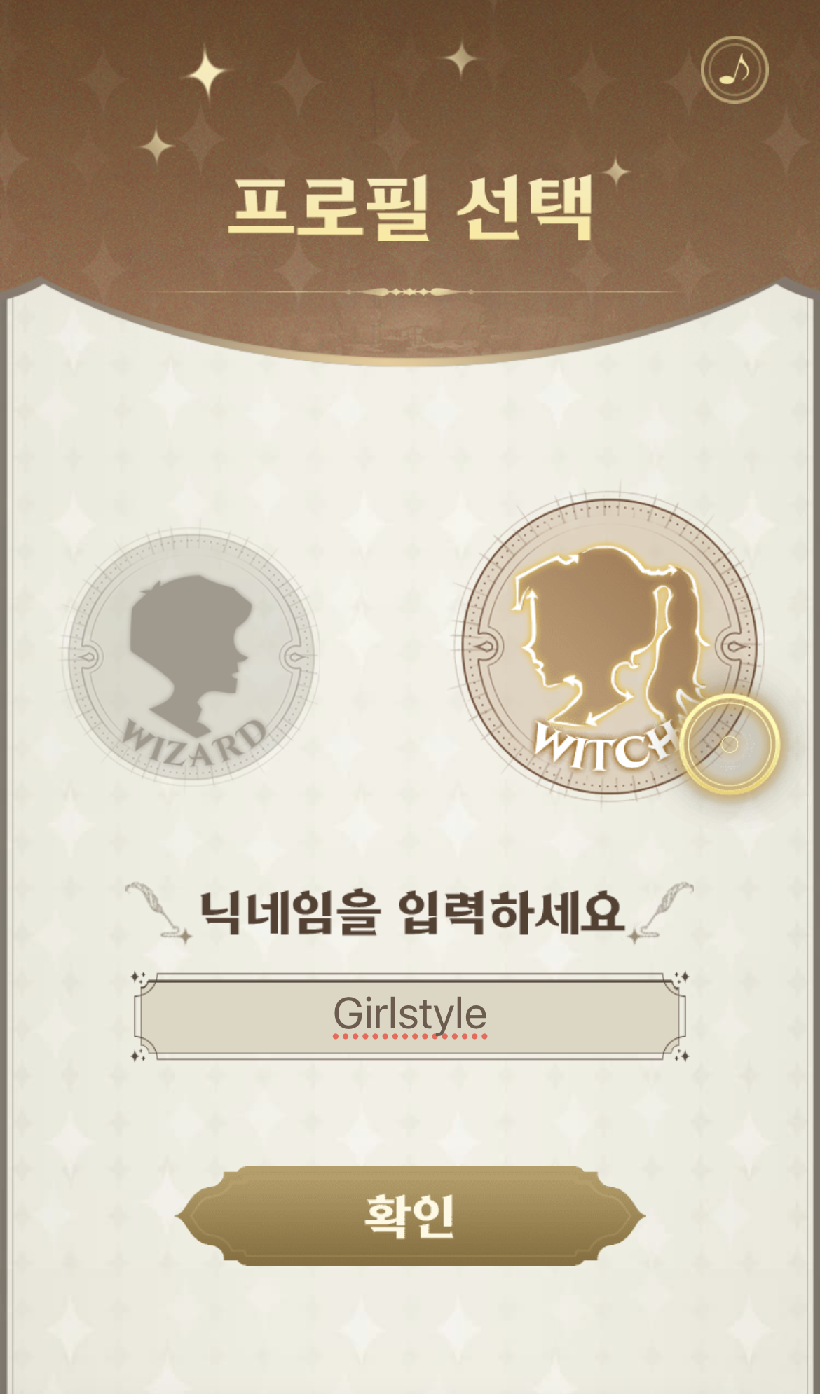 首先選擇性別是男巫師/女巫師,再輸入你的名字,按下啡色的「確認」鍵。