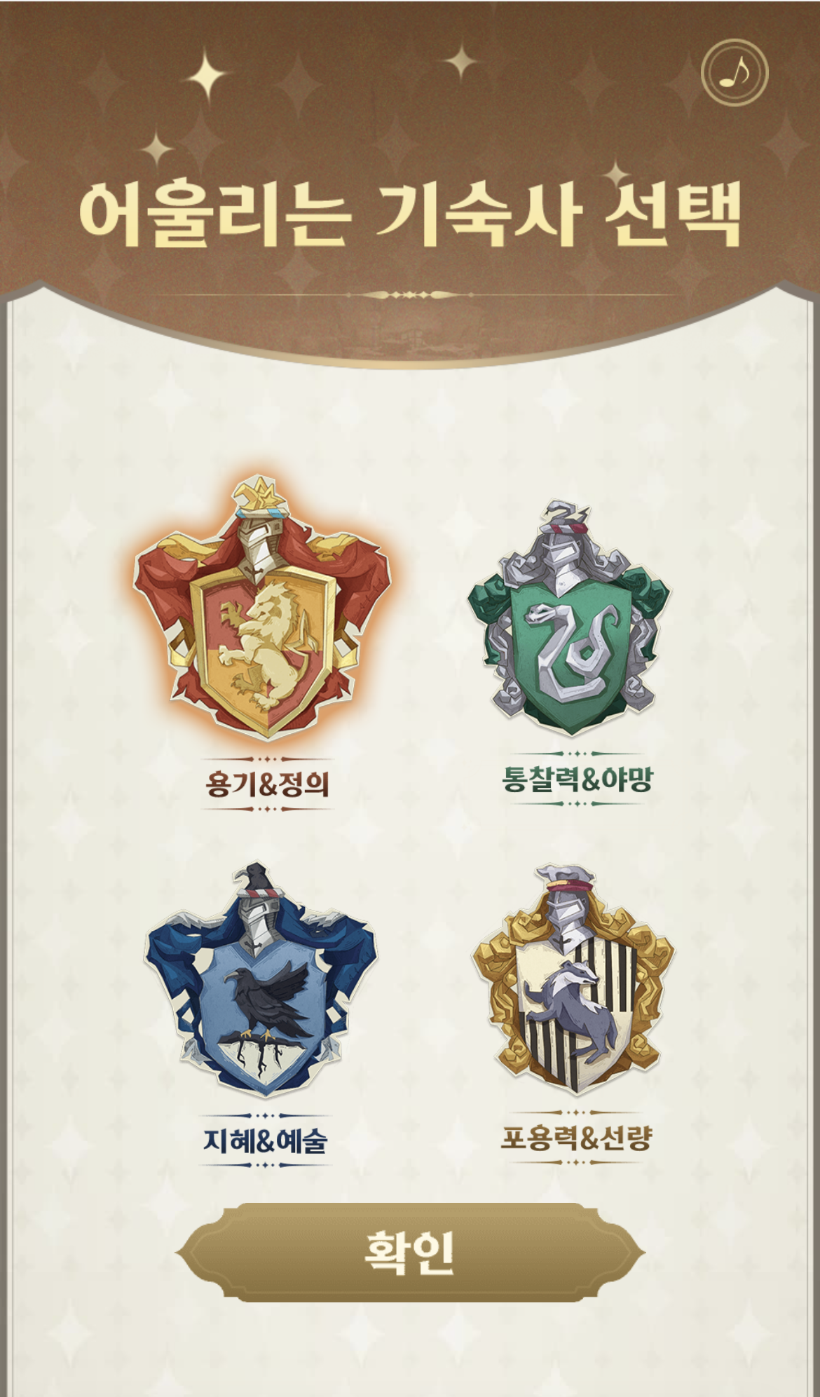 接着,大家可以揀選自己喜歡的學院,分別是代表著正義和勇氣的葛萊分多(Gryffindor)、充滿洞察力和野心慾望的史萊哲林(Slytherin)、代表著智慧和藝術的雷文克勞(Ravenclaw)和代表著包容和善良的赫夫帕夫(Hufflepuff)。
