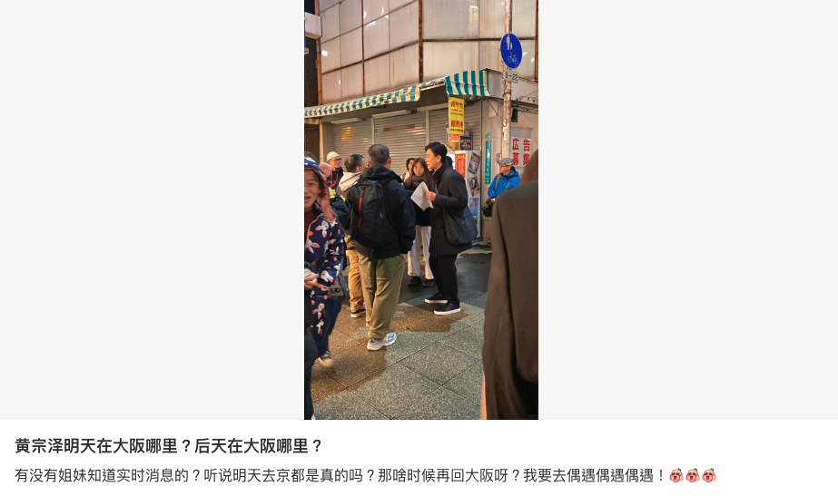 其後有不少網民拍下他們的身影,並放到社交平台分享,有人留言:「大阪來過那麼多明星,但是遇到黃宗澤我真的嫉妒了!真的好帥」、「真人真的超級帥,超有男人味」、「帥爆的黃宗澤,哪裏都有粉絲!」、「今天在日本橋偶遇黃宗澤,他太帥了,身高180左右,好年輕啊」等。也有網民表示很喜歡黃宗澤演的戲,亦有網民稱自己從小就很喜歡他。