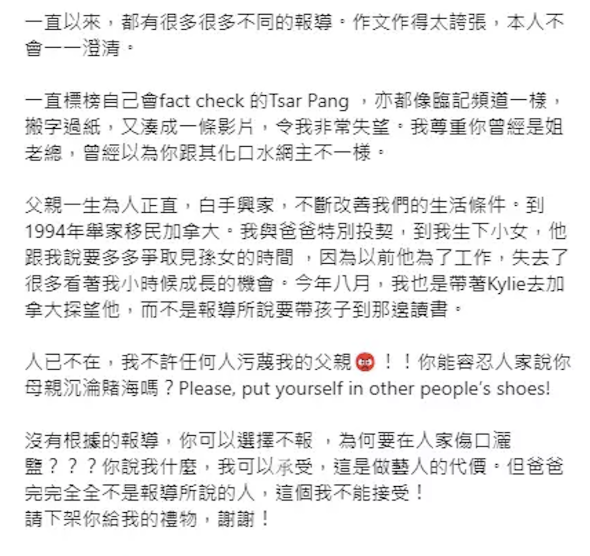 前港姐冠軍郭羨妮去年曾透露父親年底離世,當時不少網民都留言鼓勵她要振作起來!但最近郭羨妮罕有地發文怒轟YouTuber Tsar Pang報道不實,更指出他的言論污蔑其父。郭羨妮直言:「猶如在她的傷口上撒鹽!」