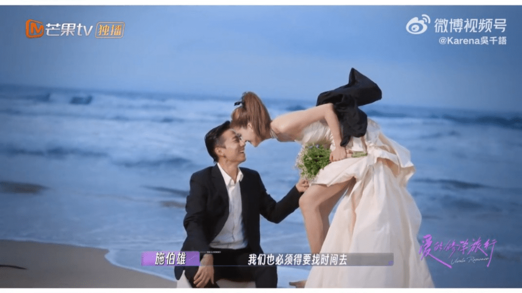 日前吳千語在社交平台轉貼了《愛的修學旅行》中海灘婚照的拍攝花絮,並寫上:「一段充滿驚喜的回憶」,從影片中可見,當日天空忽然下起微雨,而且非常大風,但兩人仍然表現得非常興奮。吳千語穿上一條白色平口的緊身短裙,大曬雪白皮膚和白滑長腿,而當她的裙擺被大風吹亂時,施伯雄亦馬上細心地幫她整理,甜蜜程度爆燈!