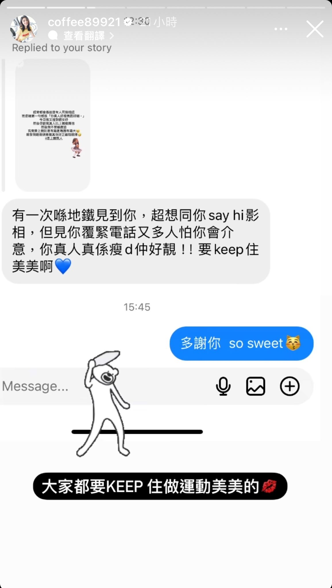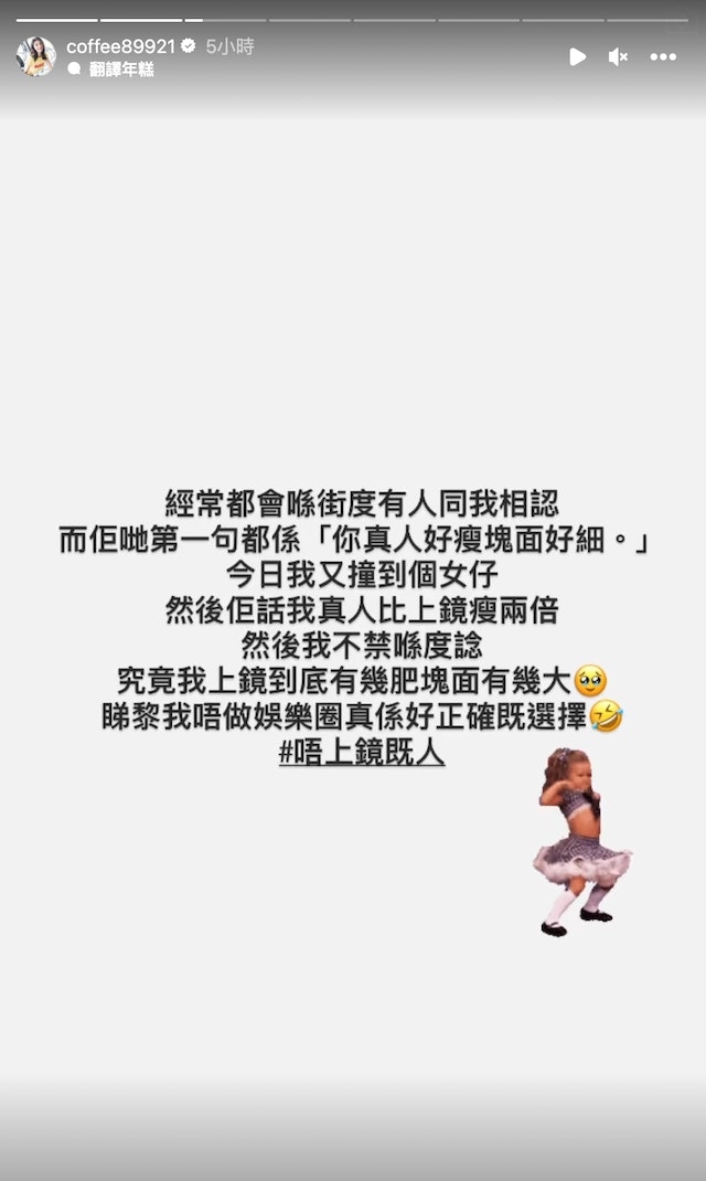 由於從事娛樂圈經常都要對住電視螢幕,但許多人都說過她本人很瘦,因此她認為自己是「唔上鏡嘅人」,不適合在電視螢幕上出現。之後Coffee又分享多一則與網民的對話,對方寫住:「有一次喺地鐵見到你,超想同你say hi影相,但見你覆緊電話又多人怕你會介意,你真人真係瘦d仲好靚!」。